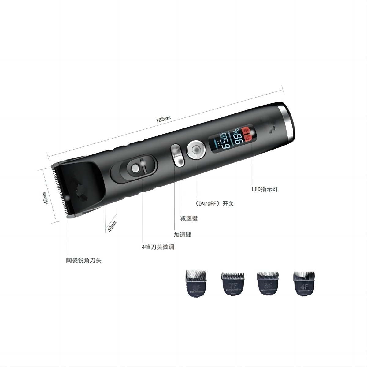 • உயர்-வரையறை LED திரையானது நிகழ்நேரத்தில் பேட்டரி அளவைக் காட்டுகிறது, சீர்ப்படுத்தும் போது மின் தடைகளைத் தடுக்கிறது மற்றும் மென்மையான வீட்டு அலங்காரம் அல்லது சலூன் சேவைகளை உறுதி செய்கிறது.